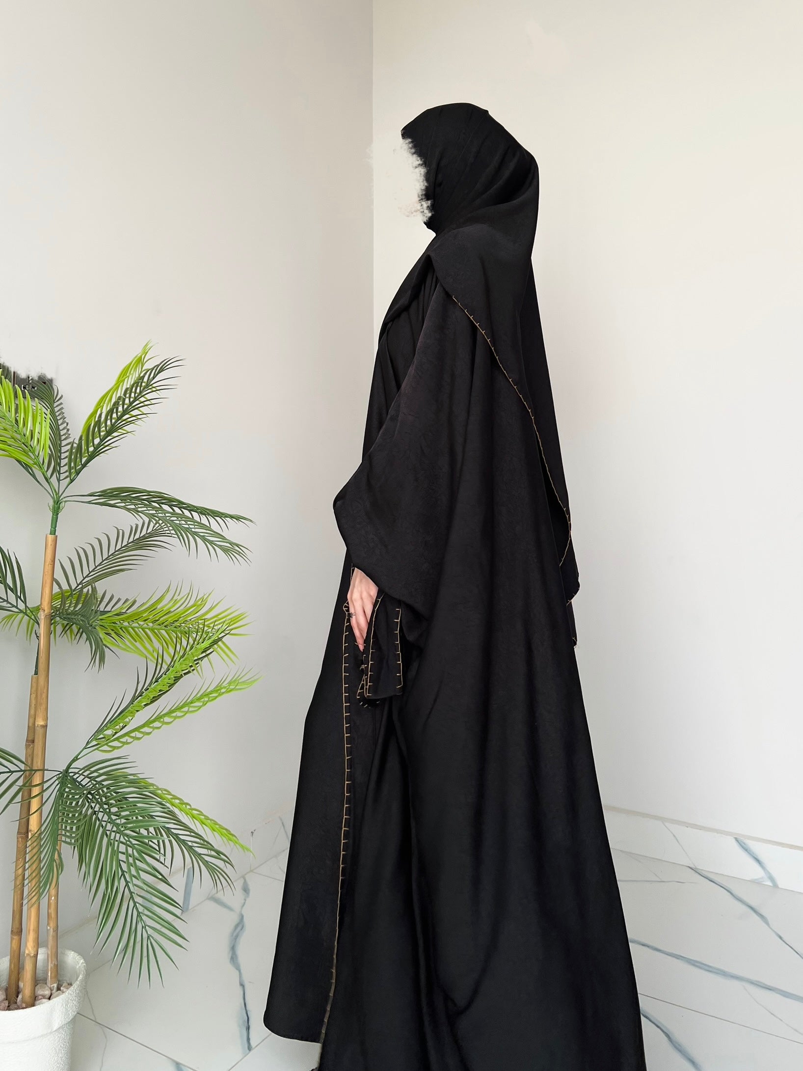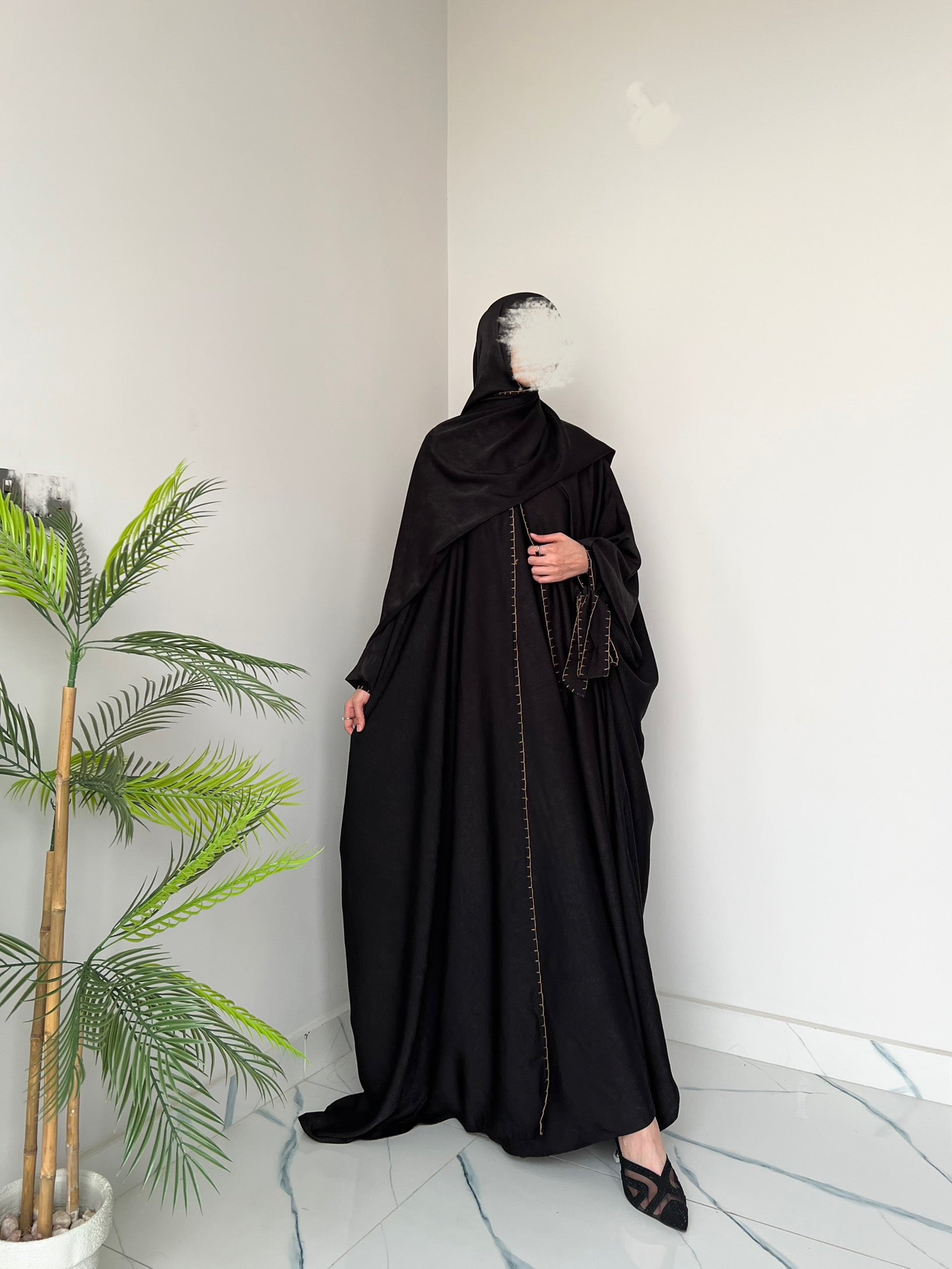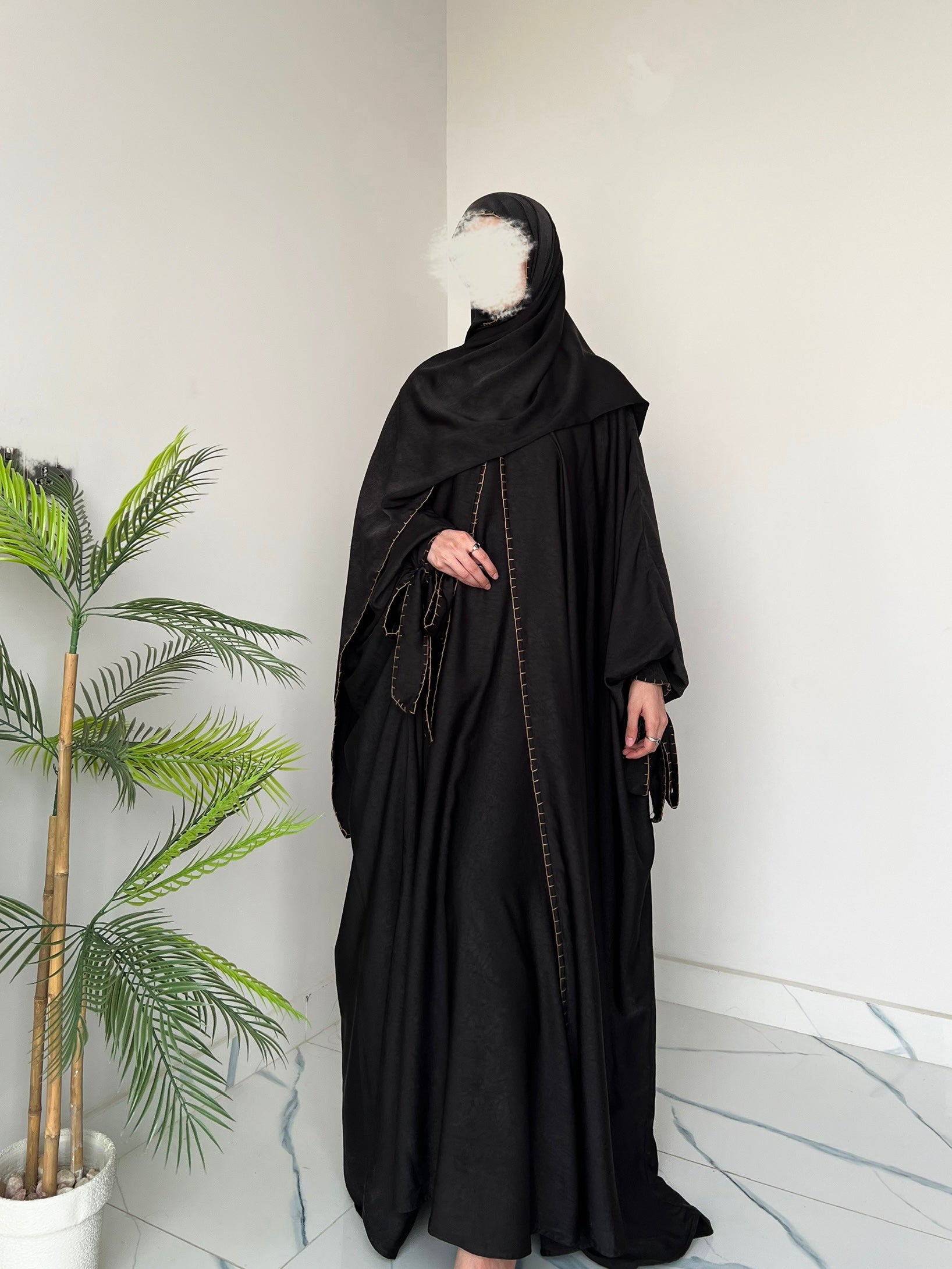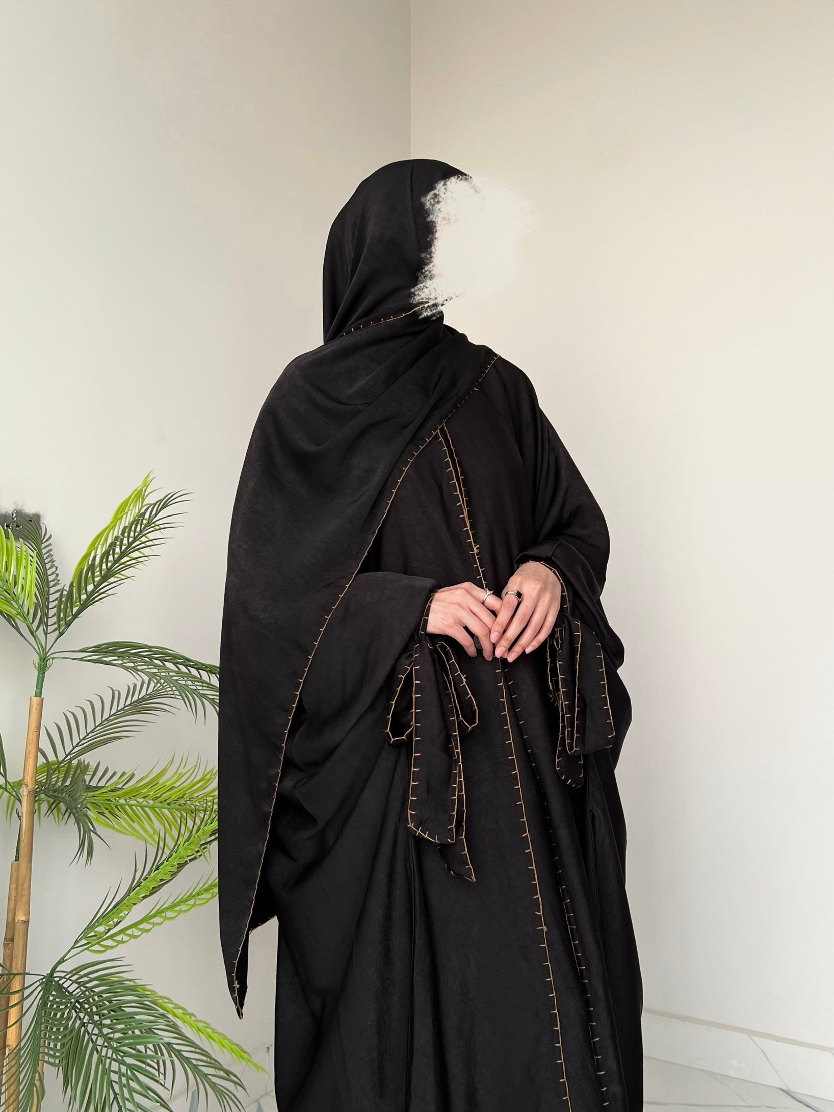 Elevate your modest wardrobe with this elegant draped abaya, crafted from premium self-embossed fabric for a soft yet structured fall. Designed with a relaxed, baggy upper for all-day comfort and effortless modesty.
