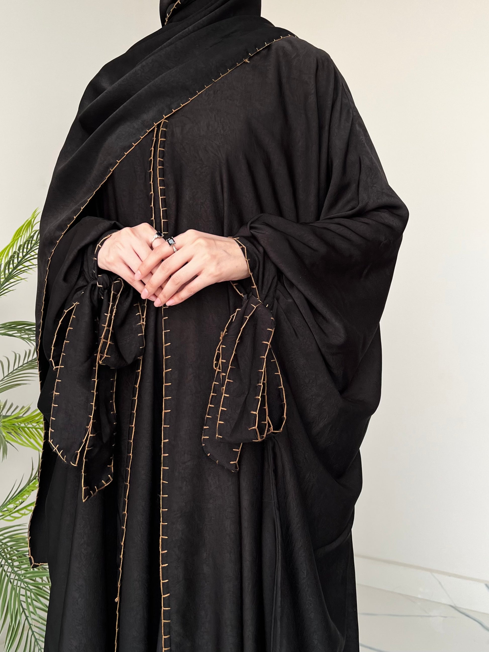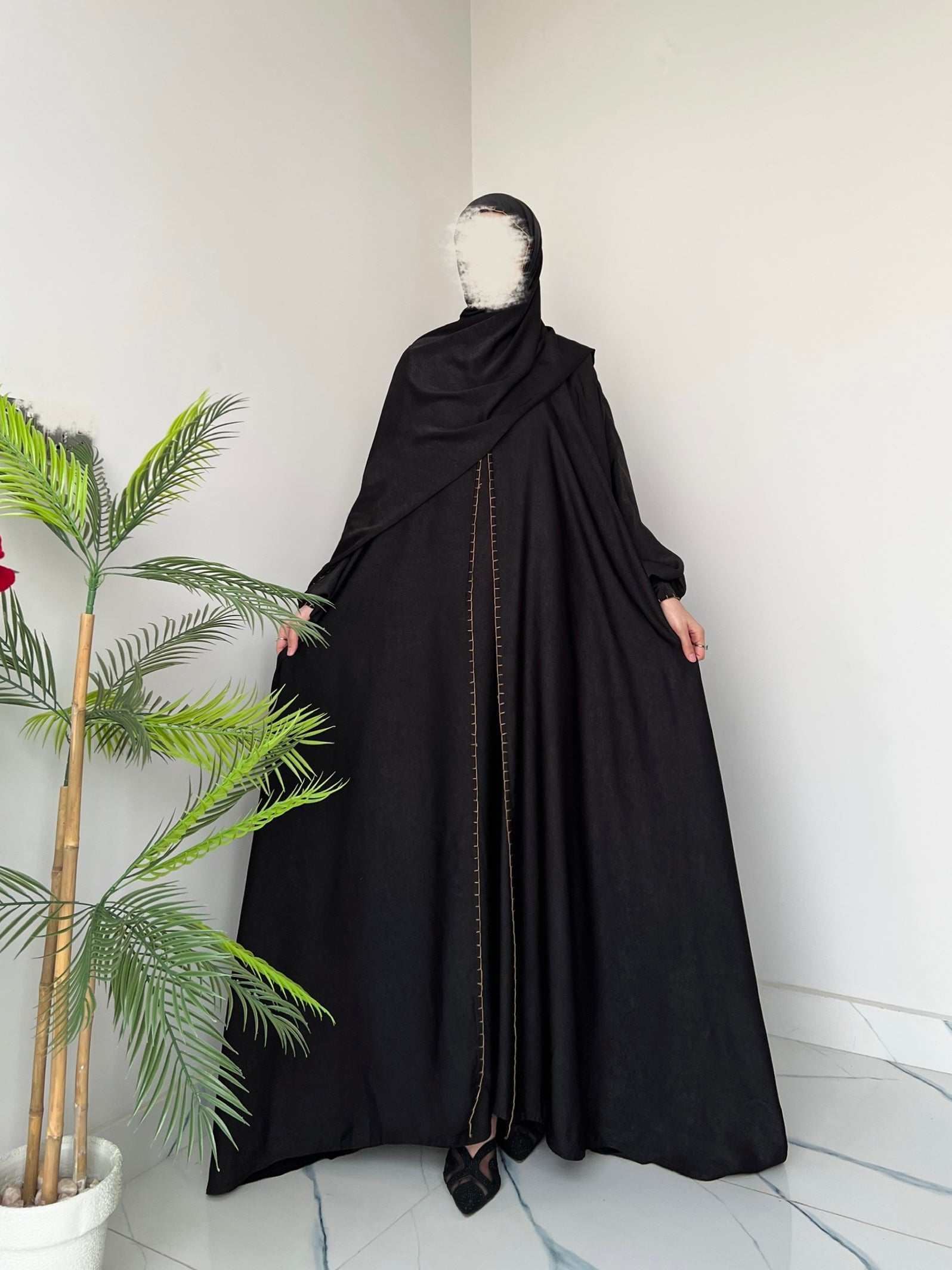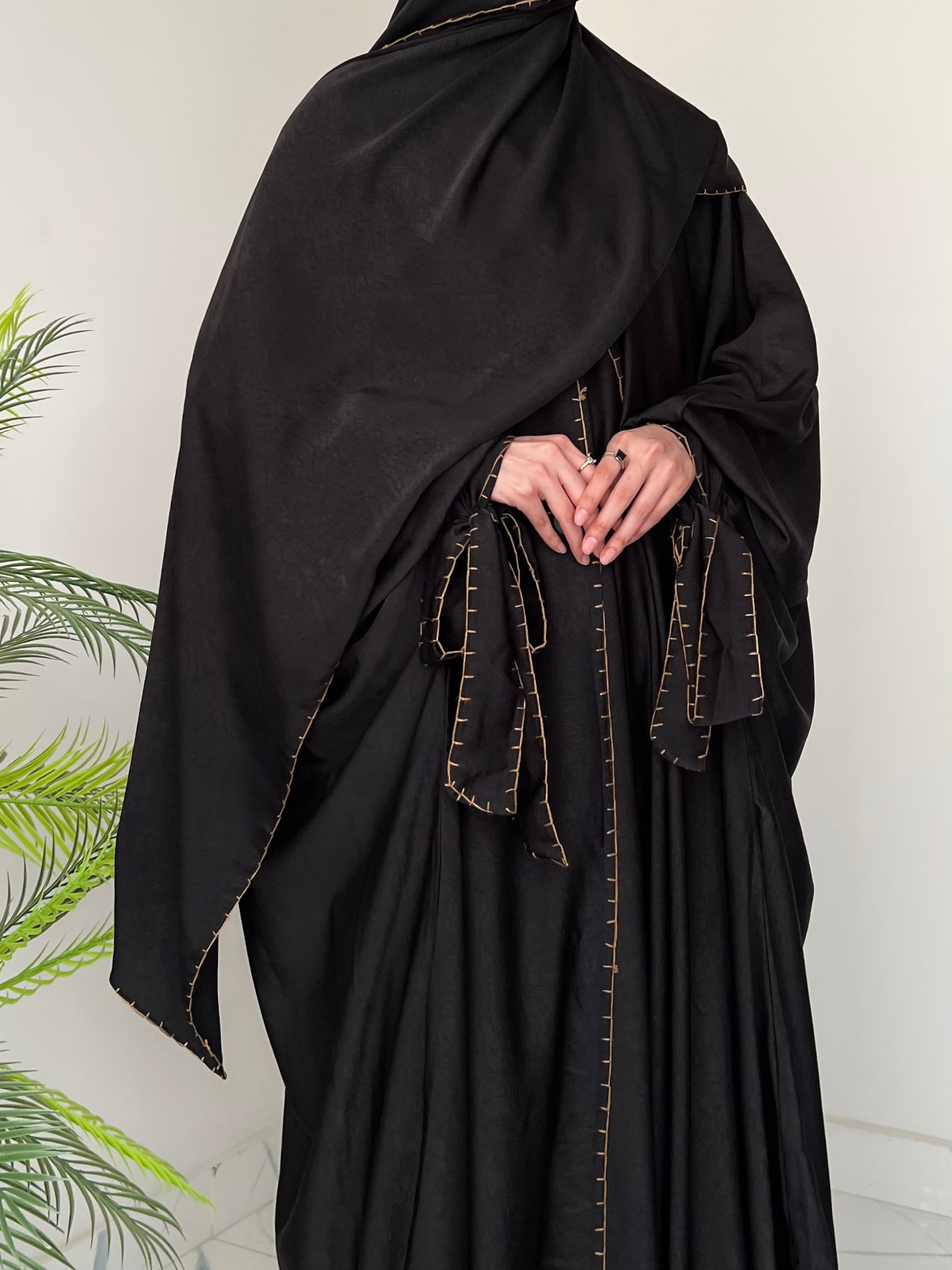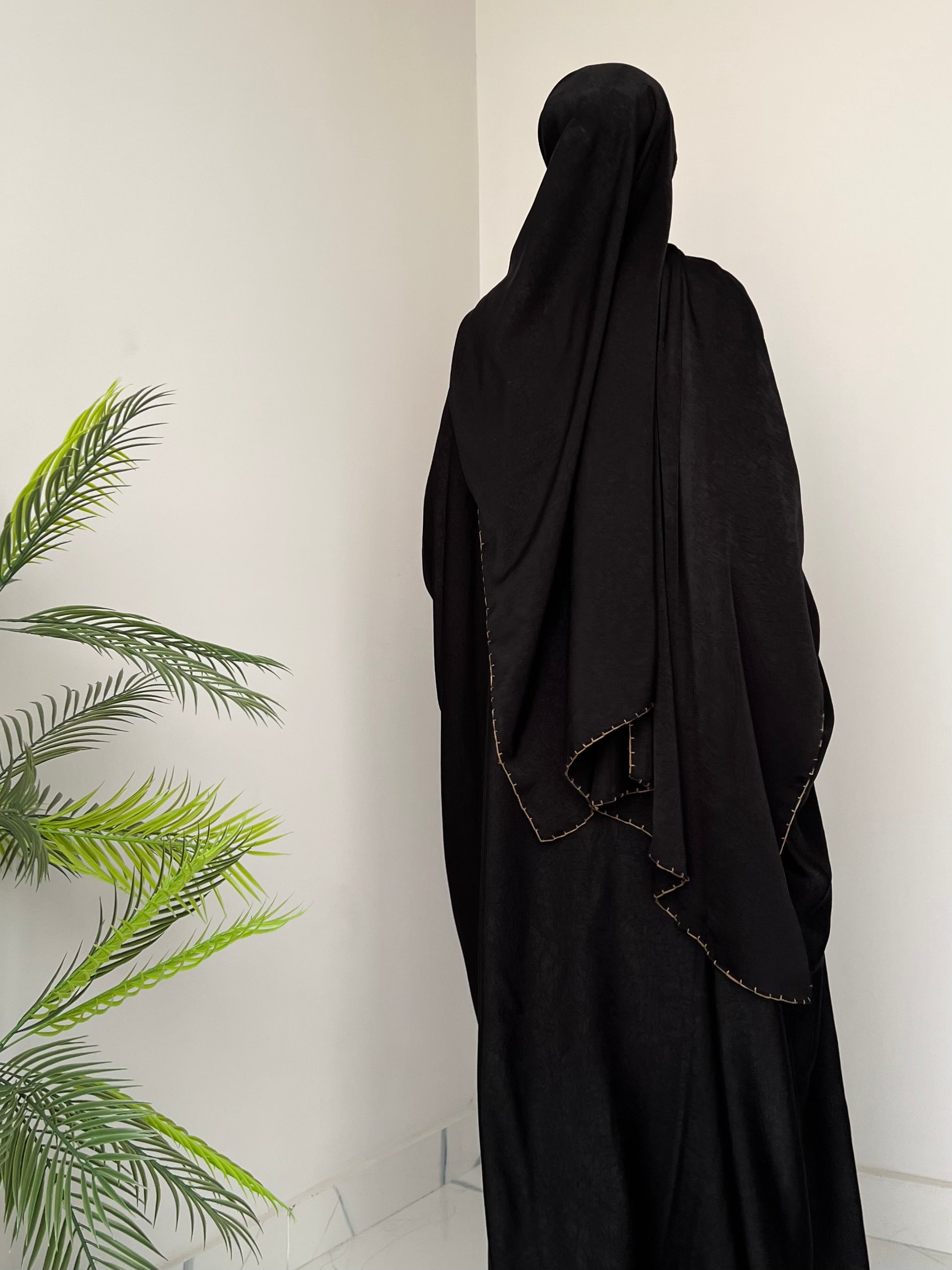 Elevate your modest wardrobe with this elegant draped abaya, crafted from premium self-embossed fabric for a soft yet structured fall. Designed with a relaxed, baggy upper for all-day comfort and effortless modesty.