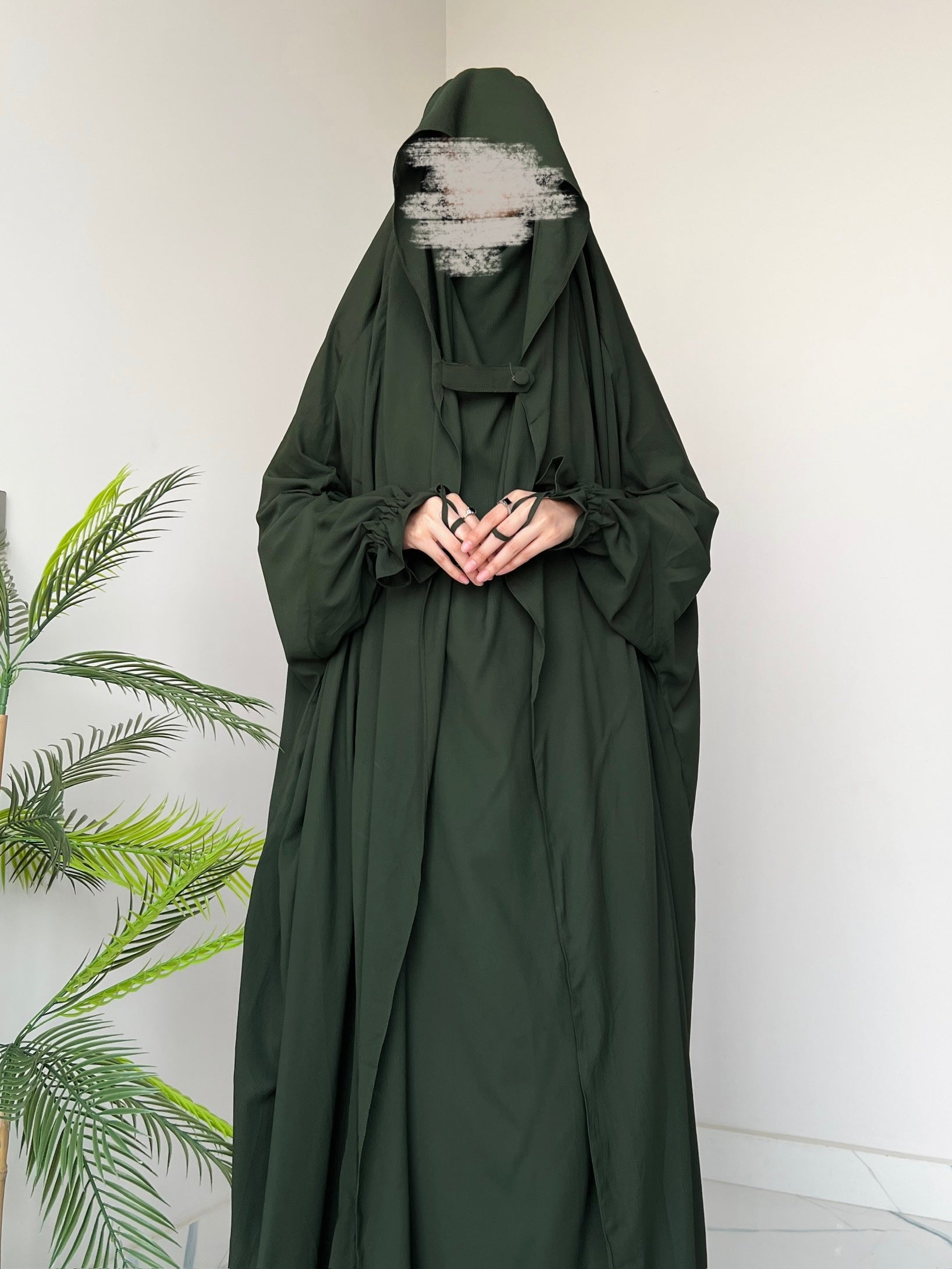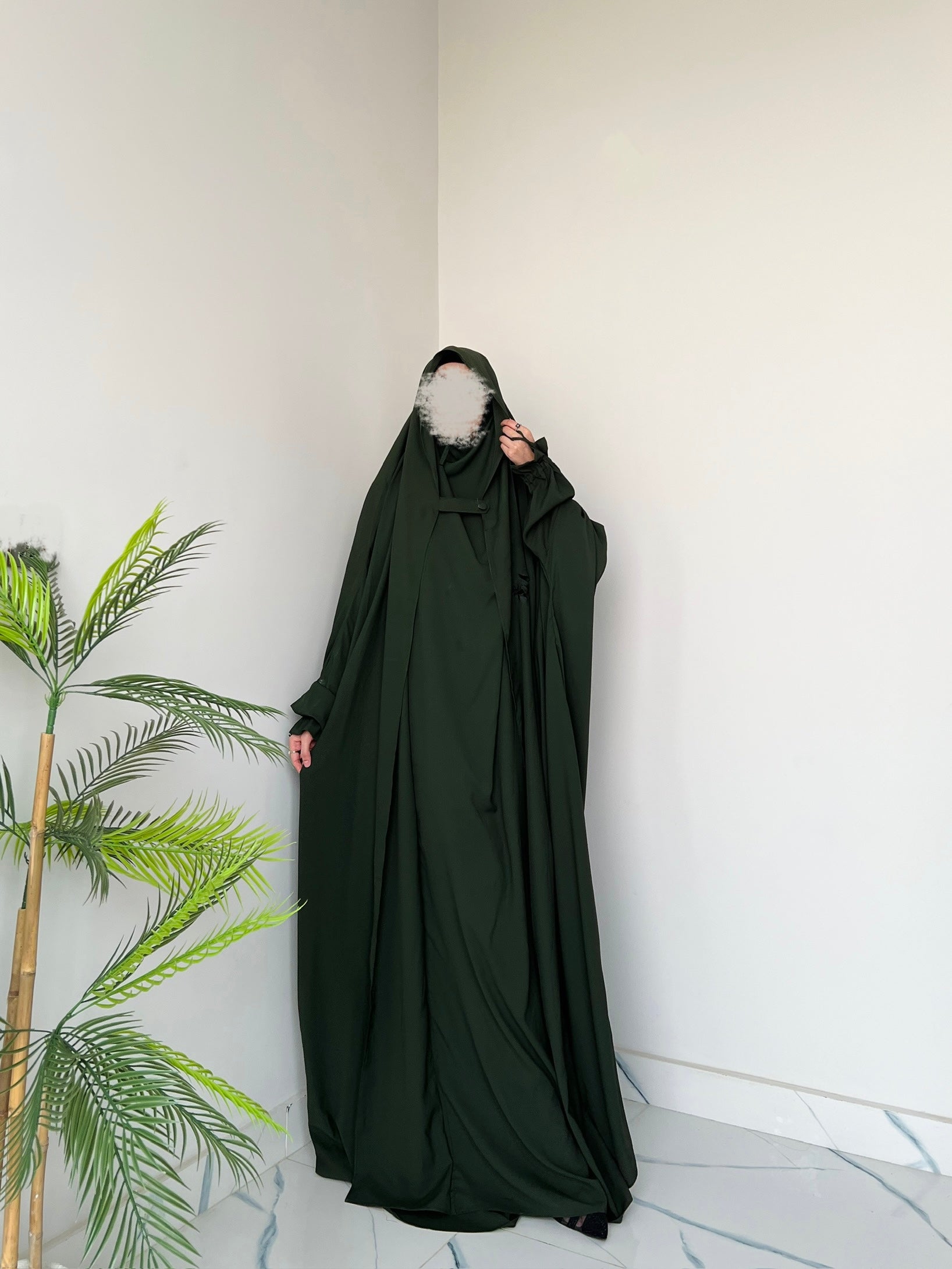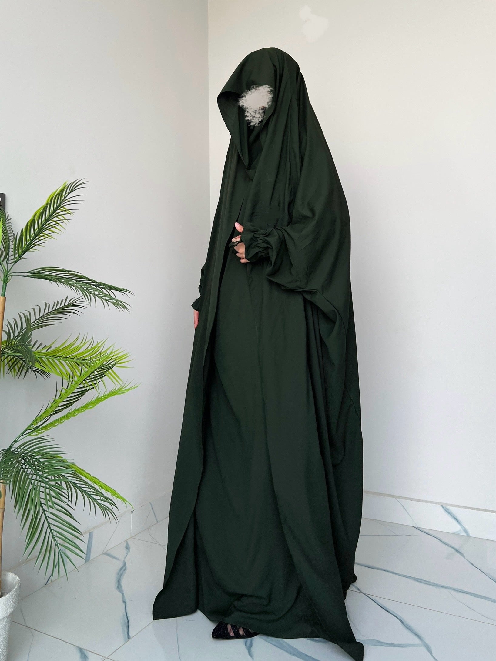 Full-length Saudi jilbab designed for effortless modesty. Featuring a practical front flap and a loose, flowy silhouette, it ensures complete coverage with comfort. The elegant green shade makes it perfect for daily wear and prayer.