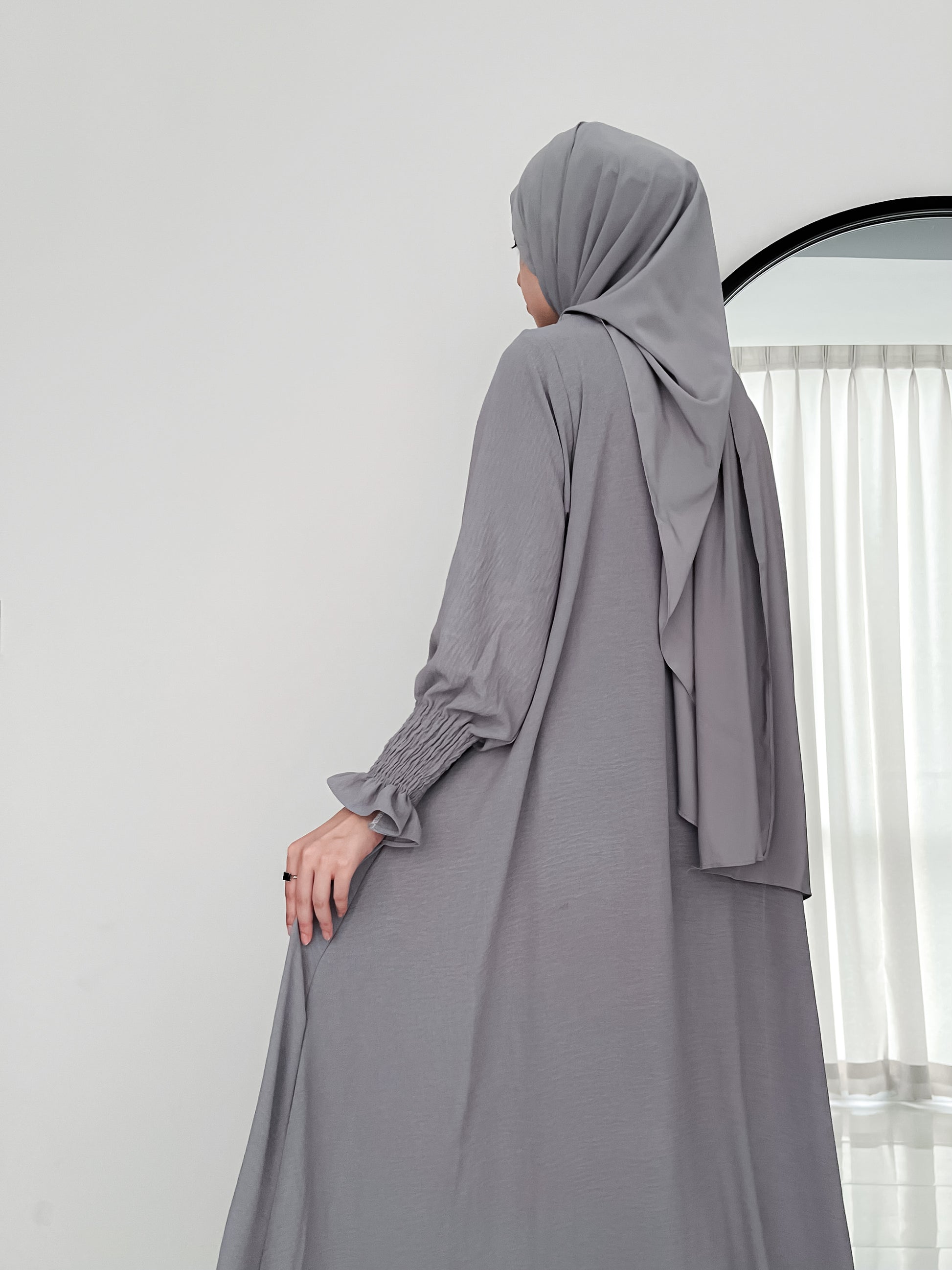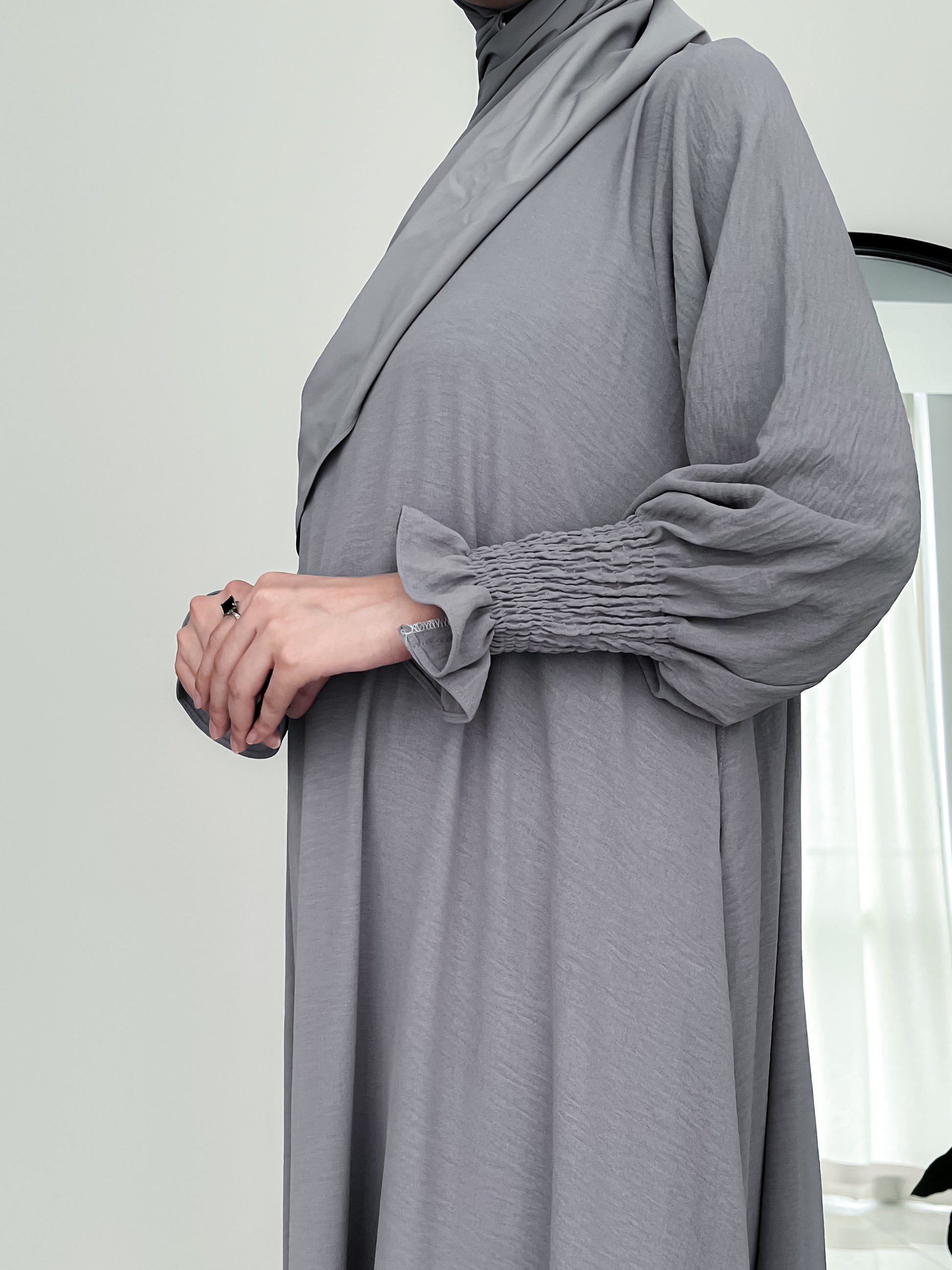 Grey Basic Abaya Is Made In Soft CEY Fabric, This Abaya Features French Frilled Sleeves And Handy Pockets On Both Sides. A Comfortable And Modest Pick For Everyday Wear.