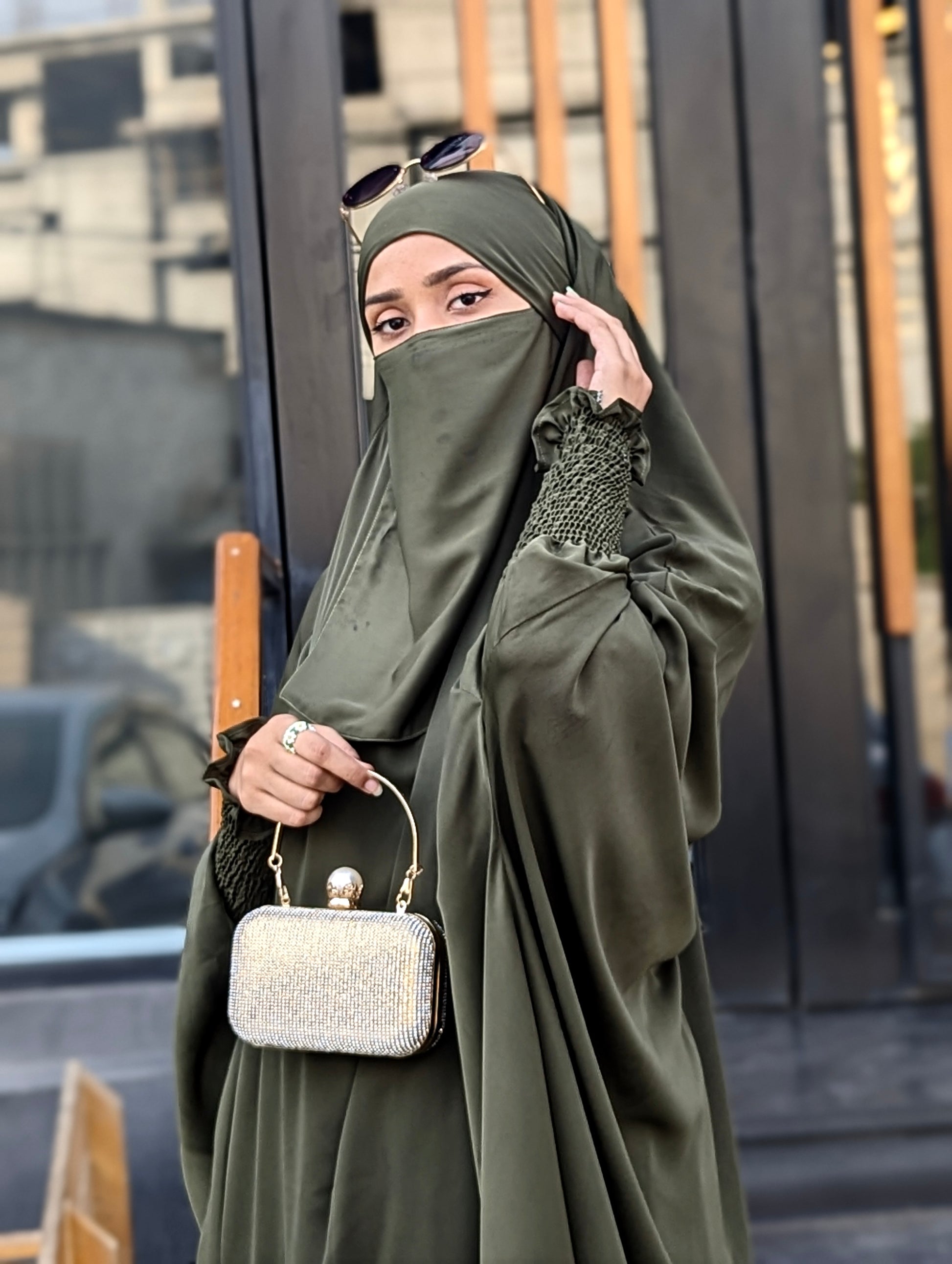 Discover Our Olive Green Three Piece Jilbab, Your Ultimate Choice For Premium Style, Coverage And Comfort. Olive Green Three Piece Jilbab Is Made In Premium Nadah Fabric. It Includes Upper Piece Jilbab, Skirt And A Half Niqab. Its Upper Piece Provides Head To Knee Coverage And The Lower Skirt Covers The Bottom Part .French Sleeves Are Made For Effortless Wuzu And Stripes Are Added To Tie Niqab On Nose Or To Tie Around The Chin To Cover Neck, And A Separate Half Niqab Is Also Included.